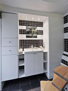 Cet appartement est équipé d'une salle de bain magnifique et claire avec des fenêtres. Cette salle d'eau bénéficie du nécessaire pour votre bien-être au quotidien : serviettes de bain, etagère, placard, douche séparée, sèche cheveux, radiateur sèche-serviettes. Les toilettes sont intégrées dans la salle de bain.