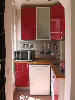 Cet appartement dispose d'une belle cuisine avec du carrelage au sol et tout l'équipement nécessaire pour votre quotidien : plaques de cuisson, réfrigerateur, micro ondes, freezer, cafetière, placard, vaisselle.