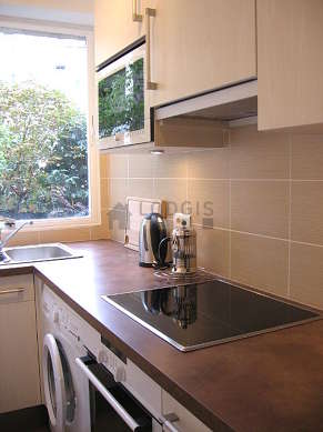 Cet appartement dispose d'une belle cuisine avec du carrelage au sol et tout l'équipement essentiel pour votre quotidien : plaques de cuisson, réfrigerateur, congélateur, four, micro ondes, hotte, grille pain, bouilloire électrique, cafetière, placard, vaisselle.