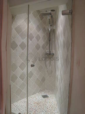 Cet appartement est équipé d'une salle de bain magnifique et très claire. Cette salle d'eau bénéficie du nécessaire pour votre bien-être au quotidien : serviettes de bain, etagère, douche séparée, sèche cheveux, lavabo. Les toilettes sont séparées de la salle de bain et situées dans une pièce indépendante.