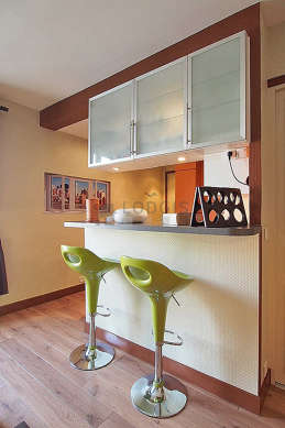 Cet appartement est composé d'un charmant salon avec du parquet au sol et des fenêtres double vitrage et vue sur cour. Ce salon très calme est meublé et équipé pour rendre votre séjour agréable : 2 fauteuil(s), table basse, 2 chaise(s), tabouret.