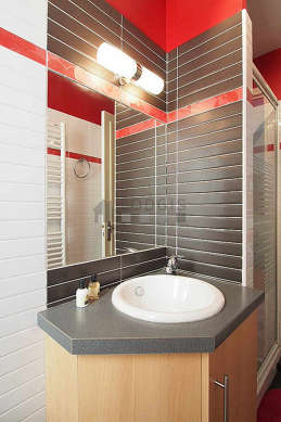 Cet appartement est équipé d'une salle de bain agréable et claire avec des fenêtres. Cette salle d'eau bénéficie du nécessaire pour votre bien-être au quotidien : serviettes de bain, placard, douche séparée, sèche cheveux, radiateur sèche-serviettes. Les toilettes sont intégrées dans la salle de bain.