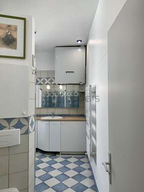 Cet appartement dispose d'une belle cuisine avec du carrelage au sol et tout l'équipement nécessaire pour votre quotidien : plaques de cuisson, réfrigerateur, congélateur, four, micro onde combiné, hotte, grille pain, bouilloire électrique, cafetière, placard, vaisselle.