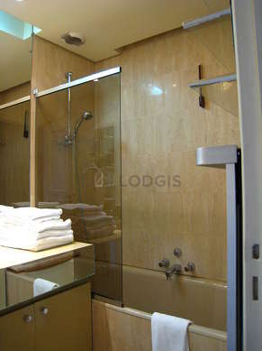 Cet appartement est équipé d'une salle de bain agréable et claire. Cette salle d'eau bénéficie du nécessaire pour votre bien-être au quotidien : serviettes de bain, etagère, placard, baignoire, sèche cheveux. Les toilettes sont séparées de la salle de bain et situées dans une pièce indépendante.