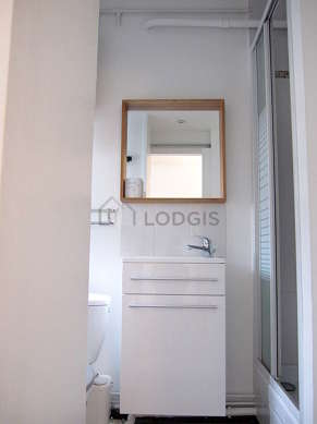 Cet appartement est équipé d'une salle de bain agréable et claire avec des fenêtres double vitrage. Cette salle d'eau bénéficie du nécessaire pour votre bien-être au quotidien : serviettes de bain, penderie, etagère, placard, douche séparée, sanibroyeur. Les toilettes sont intégrées dans la salle de bain.