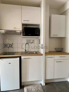 Cet appartement dispose d'une cuisine et tout l'équipement nécessaire pour votre quotidien : plaques de cuisson, réfrigerateur, micro ondes, hotte, placard.