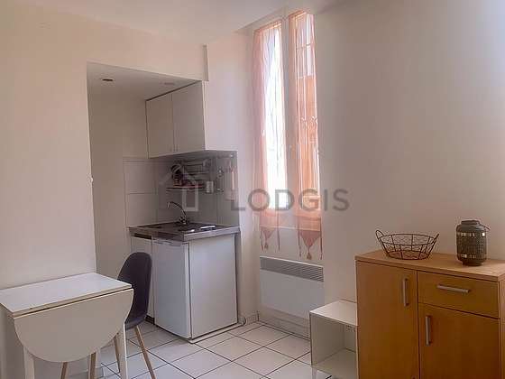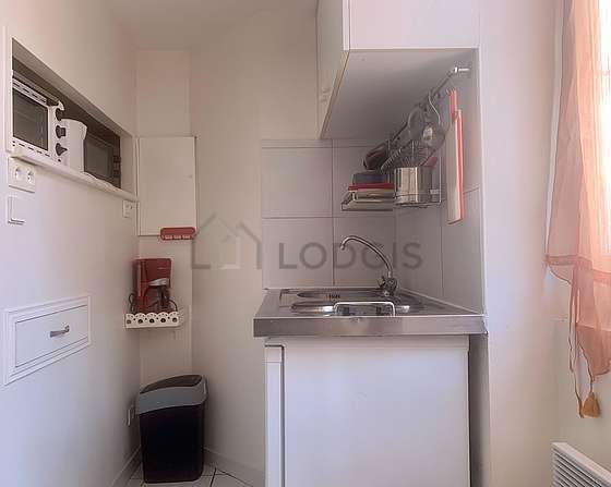 Cet appartement dispose d'une cuisine et tout l'équipement essentiel pour votre quotidien : plaques de cuisson, réfrigerateur, micro ondes, micro onde combiné, cafetière, etagère, placard, vaisselle.