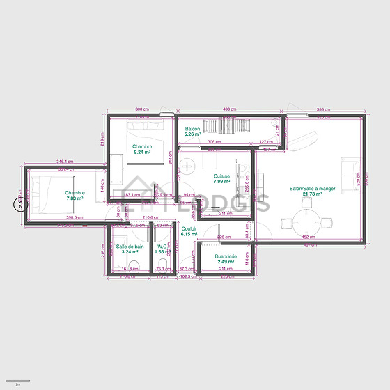 Cet appartement est composé d'un salon des fenêtres double vitrage. Ce salon est meublé et équipé pour rendre votre séjour agréable : télé, canapé, table à manger, table basse, bibliothèque, etagère, 1 chaise(s), tabouret, lampadaire sur pied.