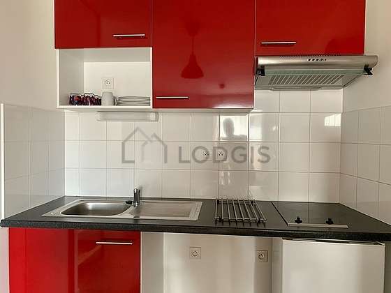 Cet appartement dispose d'une magnifique cuisine avec du carrelage au sol et tout l'équipement indispensable pour votre quotidien : plaques de cuisson, hotte, table à manger, placard, tabouret.