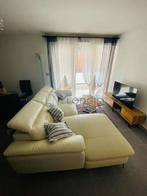 Cet appartement est composé d'un salon avec du carrelage au sol et des fenêtres. Ce salon est meublé et équipé pour rendre votre séjour agréable : télé, canapé, table basse.