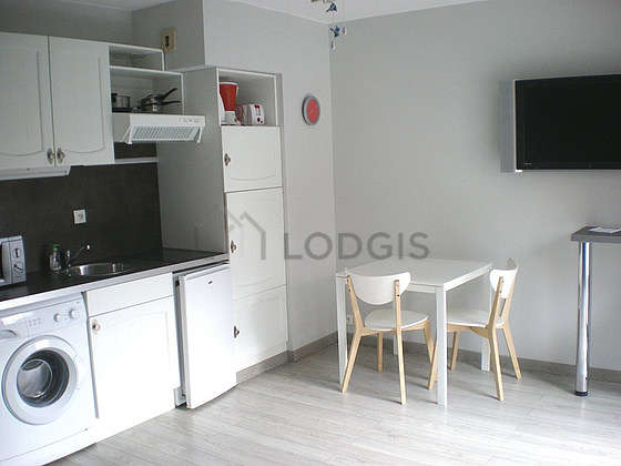 Questo appartamento dispone di una cucina e tutto l'equipaggiamento indispensabile per la vita quotidiana : piani di cottura, frigorifero, forno microonde, congelatore, cappa di aspirazione, armadio, stoviglie.