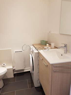 Questo appartamento é equipaggiato di un bagno. Questo bagno é dotato di tutto il necessario per il tuo benessere quotidiano : armadio, doccia, sink. Il WC é integrato nel bagno