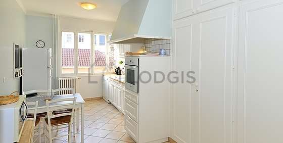 Questo appartamento dispone di una cucina con del piastrelle al suolo e tutto l'equipaggiamento necessario per la vita quotidiana : piani di cottura, frigorifero, congelatore, forno, forno microonde, cappa di aspirazione, tostapane, bollitore elettrico, caffettiera, tavola da pranzo, scaffale, armadio, stoviglie, 1 sedia (e), soup plates, plates, bowl, casserole dish, cooking knives, bread knife, lid, cutlery, wooden spoon, hot plate, peeler, drying up stand, salad mixer, whisk, ladle, cooking pot, cake tin, mugs, tin opener, sieve, chopping board, work surface, baking dish, service dish, stove, bin, grater, salad mixer, placemat, painting, coffee cups, tea cups, tea pot, cork screw, champagne glass, water glass, wine glass.