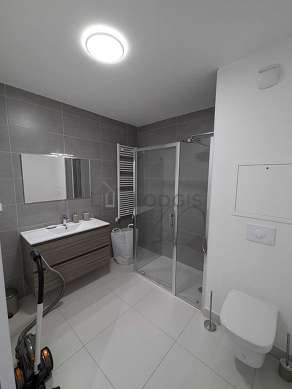 Questo appartamento é equipaggiato di un bagno. Questo bagno é dotato di tutto il necessario per il tuo benessere quotidiano : asciugamani da bagno, doccia, asciugacapelli, sink, mirror, bin, radiatore porta asciugamani. Il WC é integrato nel bagno