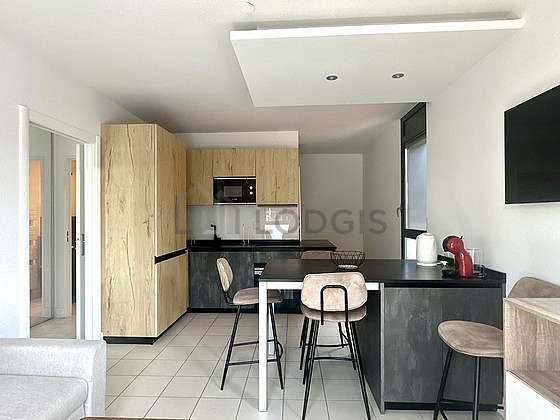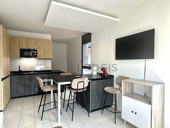 Questo appartamento dispone di una cucina con del piastrelle al suolo e tutto l'equipaggiamento essenziale per la vita quotidiana : piani di cottura, congelatore, forno, forno microonde, ferro da stiro, bollitore elettrico, tavola da pranzo, stoviglie, sgabello.