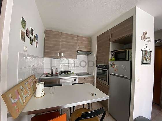Questo appartamento dispone di una cucina adiacent al soggiorno con del piastrelle al suolo e tutto l'equipaggiamento indispensabile per la vita quotidiana : piani di cottura, frigorifero, congelatore, forno, forno microonde, cappa di aspirazione, stoviglie.
