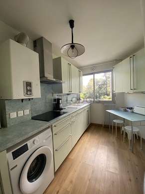 Questo appartamento dispone di una cucina con del parquet al suolo e tutto l'equipaggiamento essenziale per la vita quotidiana : frigorifero, forno, microonde multifunzione, tostapane, bollitore elettrico, caffettiera, tavola da pranzo, sgabello.