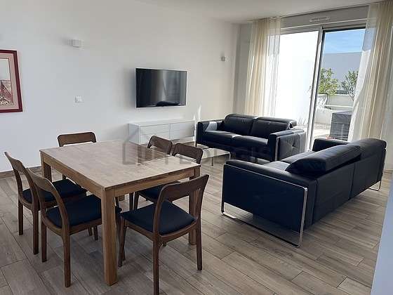 Questo appartamento é composto di un salone con del parquet al suolo e delle finestras. Questo salone é ammobiliato e equipaggiato per rendere il tuo soggiorno piacevole : divano, tavola da pranzo, 1 sedia (e).