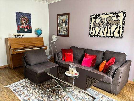 Questo appartamento é composto di un bello salone con del parquet al suolo e delle finestras e vista su strada. Questo salone calmo é ammobiliato e equipaggiato per rendere il tuo soggiorno piacevole : televisione, divano, 2 poltrona (e), tavola da pranzo, tavolino, scrivania, scaffale, 2 sedia (e).
