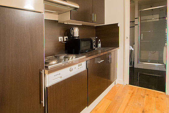 Questo appartamento dispone di una bella cucina con del parquet al suolo e tutto l'equipaggiamento indispensabile per la vita quotidiana : piani di cottura, frigorifero, forno, forno microonde, cappa di aspirazione, armadio, stoviglie.
