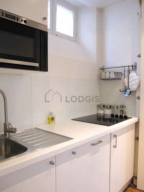 Questo appartamento dispone di una bella cucina adiacent al soggiorno con del parquet al suolo e tutto l'equipaggiamento necessario per la vita quotidiana : piani di cottura, frigorifero, forno microonde, congelatore, tostapane, bollitore elettrico, caffettiera, armadio, stoviglie.