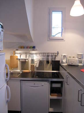 Questo appartamento dispone di una bella cucina adiacent al soggiorno con del piastrelle al suolo e tutto l'equipaggiamento indispensabile per la vita quotidiana : piani di cottura, frigorifero, congelatore, microonde multifunzione, tostapane, bollitore elettrico, caffettiera, scaffale, armadio, stoviglie, sgabello, bar.
