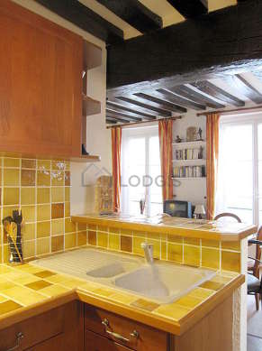 Questo appartamento dispone di una bella cucina adiacent al soggiorno con del piastrelle al suolo e tutto l'equipaggiamento indispensabile per la vita quotidiana : piani di cottura, frigorifero, forno, forno microonde, congelatore, cappa di aspirazione, tostapane, bollitore elettrico, armadio, stoviglie, sgabello, bar.