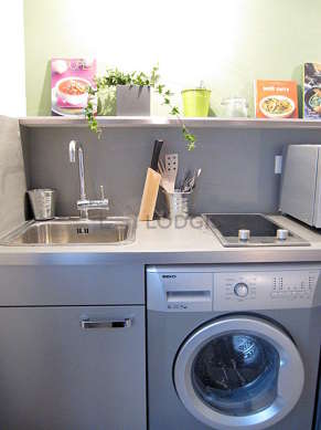 Questo appartamento dispone di una bella cucina con del parquet al suolo e tutto l'equipaggiamento indispensabile per la vita quotidiana : piani di cottura, frigorifero, microonde multifunzione, congelatore, tostapane, bollitore elettrico, caffettiera, scaffale, armadio, stoviglie.