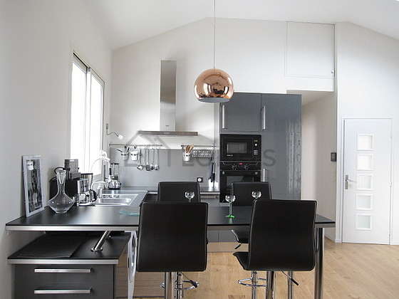 Questo appartamento dispone di una bella cucina adiacent al soggiorno con del parquet al suolo e tutto l'equipaggiamento necessario per la vita quotidiana : piani di cottura, frigorifero, congelatore, forno, forno microonde, cappa di aspirazione, tostapane, caffettiera, scaffale, armadio, stoviglie, robot da cucina, sgabello, bar.