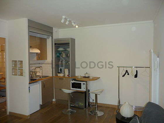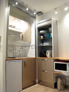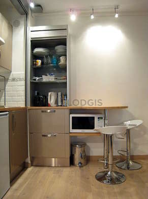 Questo appartamento dispone di una bella cucina adiacent al soggiorno con del parquet al suolo e tutto l'equipaggiamento essenziale per la vita quotidiana : piani di cottura, frigorifero, forno microonde, congelatore, cappa di aspirazione, tostapane, bollitore elettrico, scaffale, stoviglie, sgabello, bar.