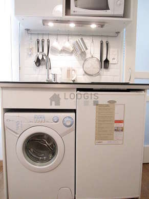 Questo appartamento dispone di una cucina con del parquet al suolo e tutto l'equipaggiamento indispensabile per la vita quotidiana : piani di cottura, frigorifero, forno microonde, tostapane, bollitore elettrico, caffettiera, armadio, stoviglie.