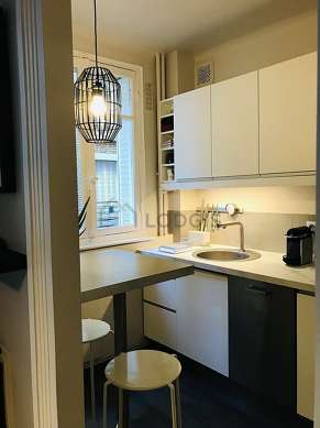 Questo appartamento dispone di una magnifica cucina con del piastrelle al suolo e tutto l'equipaggiamento necessario per la vita quotidiana : piani di cottura, frigorifero, microonde multifunzione, congelatore, cappa di aspirazione, tostapane, bollitore elettrico, caffettiera, tavola da pranzo, scaffale, armadio, stoviglie, sgabello.
