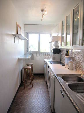 Questo appartamento dispone di una cucina con del piastrelle al suolo e tutto l'equipaggiamento essenziale per la vita quotidiana : piani di cottura, frigorifero, forno, forno microonde, congelatore, cappa di aspirazione, bollitore elettrico, caffettiera, tavola da pranzo, armadio, stoviglie, sgabello.