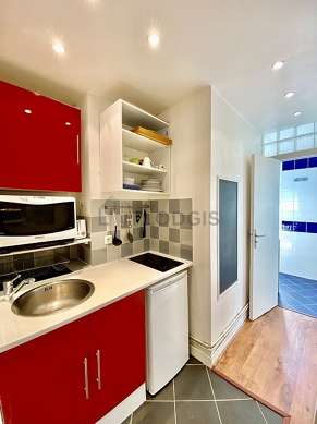Questo appartamento dispone di una bella cucina con del piastrelle al suolo e tutto l'equipaggiamento necessario per la vita quotidiana : piani di cottura, frigorifero, microonde multifunzione, tostapane, caffettiera, tavola da pranzo, scaffale, armadio, stoviglie, 1 sedia (e).