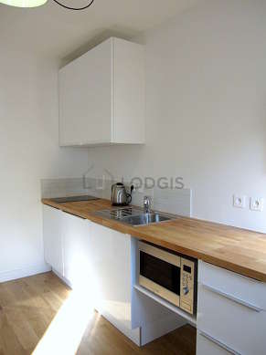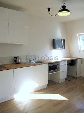 Questo appartamento dispone di una bella cucina con del parquet al suolo e tutto l'equipaggiamento necessario per la vita quotidiana : piani di cottura, frigorifero, congelatore, microonde multifunzione, bollitore elettrico, tavola da pranzo, armadio, stoviglie, sgabello.