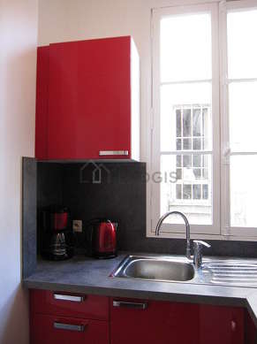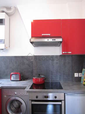 Questo appartamento dispone di una bella cucina con del piastrelle al suolo e tutto l'equipaggiamento essenziale per la vita quotidiana : piani di cottura, frigorifero, forno, cappa di aspirazione, tostapane, bollitore elettrico, caffettiera, armadio, stoviglie.