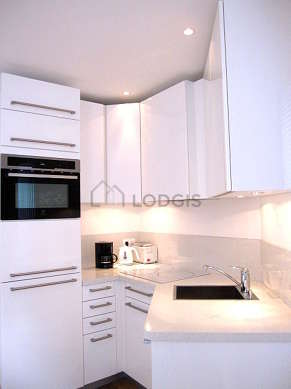 Questo appartamento dispone di una bella cucina con del parquet al suolo e tutto l'equipaggiamento essenziale per la vita quotidiana : piani di cottura, frigorifero, congelatore, microonde multifunzione, cappa di aspirazione, tostapane, bollitore elettrico, caffettiera, armadio, stoviglie.