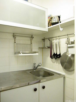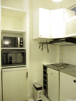 Questo appartamento dispone di una bella cucina con del piastrelle al suolo e tutto l'equipaggiamento essenziale per la vita quotidiana : piani di cottura, frigorifero, forno, forno microonde, congelatore, cappa di aspirazione, tostapane, bollitore elettrico, scaffale, armadio.