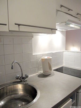 Questo appartamento dispone di una bella cucina con del piastrelle al suolo e tutto l'equipaggiamento indispensabile per la vita quotidiana : piani di cottura, frigorifero, forno microonde, congelatore, cappa di aspirazione, tostapane, bollitore elettrico, armadio, stoviglie.