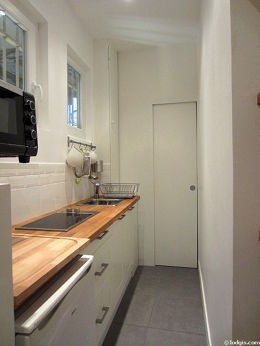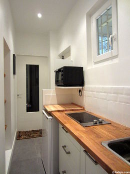 Questo appartamento dispone di una bella cucina con del piastrelle al suolo e tutto l'equipaggiamento essenziale per la vita quotidiana : piani di cottura, frigorifero, forno, tostapane, bollitore elettrico, armadio, stoviglie.