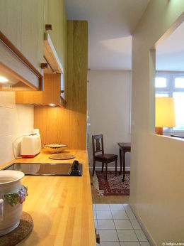 Questo appartamento dispone di una cucina con del piastrelle al suolo e tutto l'equipaggiamento indispensabile per la vita quotidiana : piani di cottura, frigorifero, congelatore, forno, microonde multifunzione, cappa di aspirazione, tostapane, bollitore elettrico, caffettiera, armadio, stoviglie.