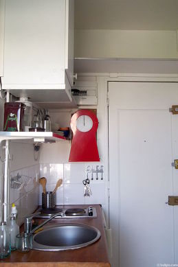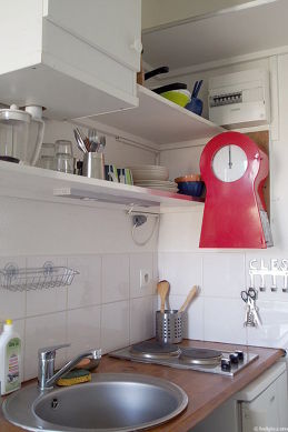 Questo appartamento dispone di una cucina con del parquet al suolo e tutto l'equipaggiamento essenziale per la vita quotidiana : piani di cottura, frigorifero, congelatore, bollitore elettrico, caffettiera, scaffale, stoviglie.