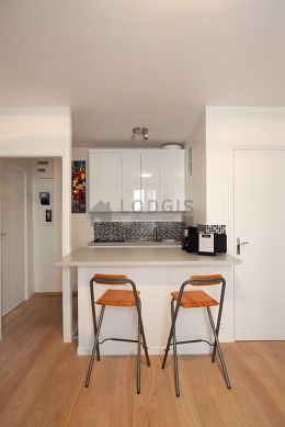 Questo appartamento dispone di una bella cucina con del piastrelle al suolo e tutto l'equipaggiamento indispensabile per la vita quotidiana : piani di cottura, frigorifero, forno microonde, congelatore, tostapane, caffettiera, armadio, stoviglie, sgabello, bar.