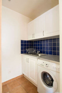 Questo appartamento dispone di una bella cucina con del piastrelle al suolo e tutto l'equipaggiamento essenziale per la vita quotidiana : piani di cottura, frigorifero, microonde multifunzione, congelatore, bollitore elettrico, armadio, stoviglie.