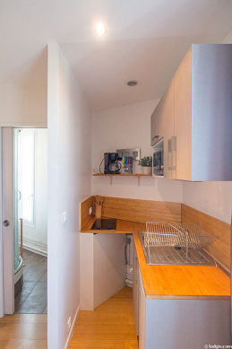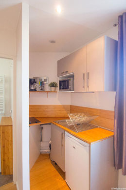 Questo appartamento dispone di una bella cucina con del parquet al suolo e tutto l'equipaggiamento indispensabile per la vita quotidiana : piani di cottura, frigorifero, congelatore, microonde multifunzione, bollitore elettrico, caffettiera, scaffale, armadio, stoviglie.