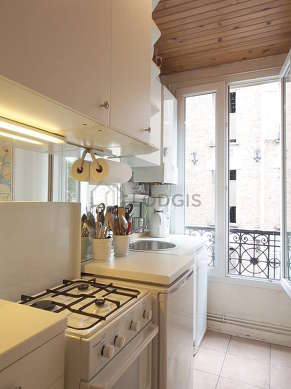 Questo appartamento dispone di una bella cucina con del piastrelle al suolo e tutto l'equipaggiamento necessario per la vita quotidiana : piani di cottura, frigorifero, forno, forno microonde, caffettiera, scaffale, armadio, stoviglie, robot da cucina.