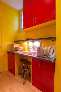 Questo appartamento dispone di una bella cucina con del parquet al suolo e tutto l'equipaggiamento necessario per la vita quotidiana : piani di cottura, frigorifero, congelatore, forno, cappa di aspirazione, tostapane, bollitore elettrico, caffettiera, armadio, stoviglie, sgabello, bar, bin.