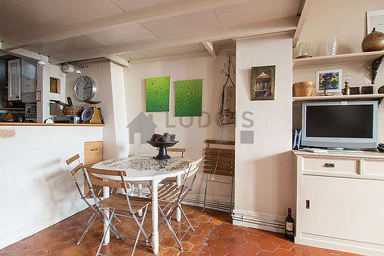 Questo appartamento é composto di un salone con della coccio al suolo e delle finestras anti-rumore. Questo salone molto calmo é ammobiliato e equipaggiato per rendere il tuo soggiorno piacevole : televisione, lenzuola, coperte, divano, 2 poltrona (e), tavola da pranzo, tavolino, scaffale, armadio, 5 sedia (e)1 divano letto.