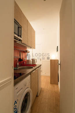 Questo appartamento dispone di una bella cucina con del parquet al suolo e tutto l'equipaggiamento necessario per la vita quotidiana : piani di cottura, frigorifero, forno microonde, congelatore, tostapane, bollitore elettrico, tavola da pranzo, scaffale, armadio, stoviglie, 2 sedia (e).