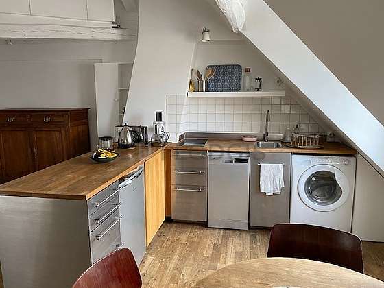 Questo appartamento dispone di una magnifica cucina con del parquet al suolo e tutto l'equipaggiamento essenziale per la vita quotidiana : piani di cottura, frigorifero, microonde multifunzione, congelatore, bollitore elettrico, tavola da pranzo, armadio, stoviglie, 4 sedia (e).